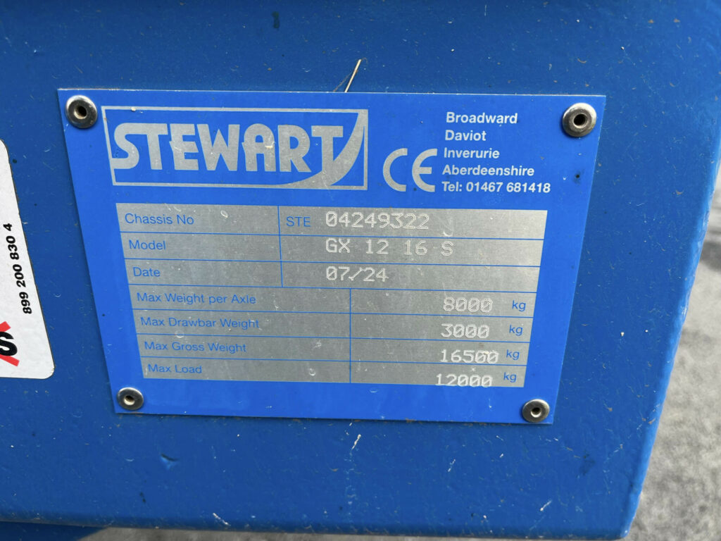 Stewart GX12-16S Grain Trailer, Year 2024, Air and Oil Brakes, 8 Stud Commercial Axles, Full Width Front Window, LED Lights, Sprung Drawbar, 560/45R22.5 tyres.