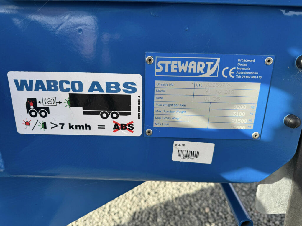 Stewart SL16-21S Trailer, year 2025, Air Braking & ABS LSV, Roll Over Cover, Front View Grill Perspex Lined, Grain Hatch, Spray flaps Front, 560/60R22.5 BKT tyres.