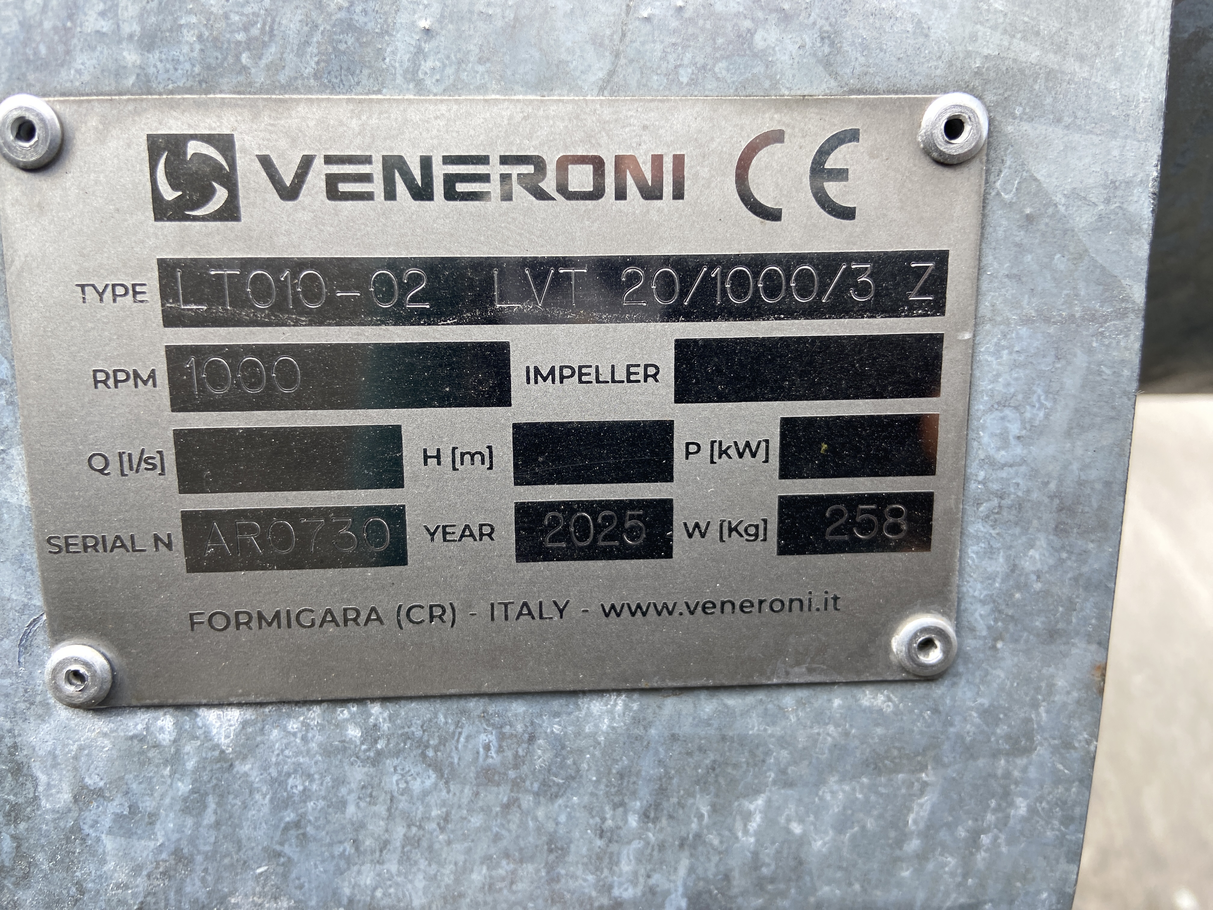 veneroni lvt20/1000/3 pump -l15 6 blades -galvanised -outlet pipe (bauer) -h frame -pto shaft