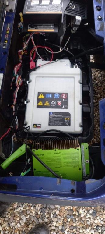 ELECTRIC BLUE 48 VOLT DC 2ND GEN LITHIUM ION, ON BOARD CHARGER, FOLD DOWN WINDSHIELD, BLACK SUNTOP, GREY PREMIUM SEATS WITH HIGH BACK, TWIN BAG CARRIER, SWEATER BASKET.