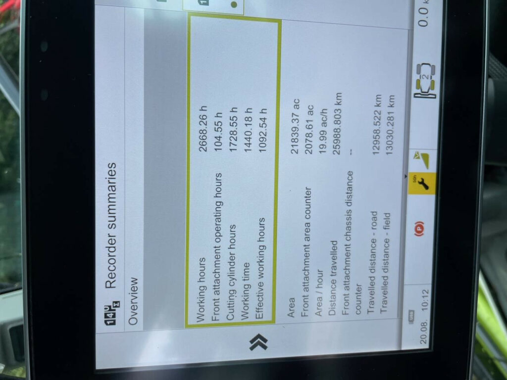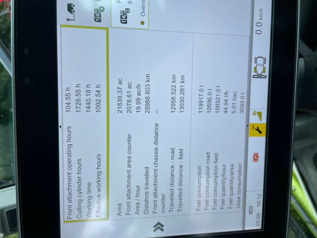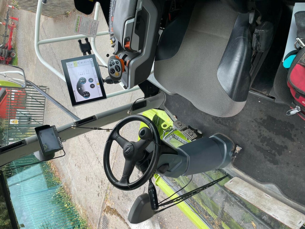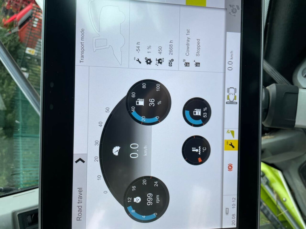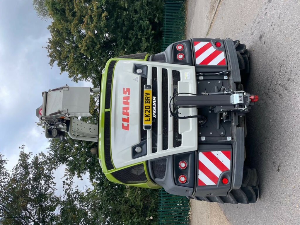 V-MAX 24-knife chopping unit, Wear ribs, serrated/smooth for lower feed roller, retro fit pack, Crop flow L, Precompression, hydraulic, Front attachment drive fixed speed, prepared for DIRECT DISC, Universal shear bar, MULTI CROP CRACKER CLASSIC M, 80/100 teeth, hard-chromeplated, Corncracker gap setting, manual, Corncracker drive M, hydraulic belt tensioning, Silage additive system with tank (375 l), Accelerator gap adjustment, standard, Upper disch. chute light. LED, pivot. action syn. with chute flap, Upper discharge chute, Rotation ring, upper discharge chute, Drive axle L (10-hole), Drive axle tyres 710/70 R38 175 D Trelleborg, Steering drive axle 4WD, rigid (8-hole), Steering axle tyres 600/65 R28 154 A8 Trelleborg, Ground speed 40 km/h, Tyre pressure control system for drive axle, MB S6-cyl. OM 473 LA, 430 kW/585 hp, ECE R 120, Fuel consumption metering, DYNAMIC POWER, Auxiliary fuel tank, 450 litres, Constant fan drive, Comfort cab w. A/C MATIC – automatic climate control and heating, Radio with MP3 function, windscreen wiper system for side and rear windows, Sun blinds for side and rear windows, Cooling unit for storage box L, CEBIS terminal leather armrest, Comfort seat, air-suspended, Work lighting, LED – Premium, Storage box L incl. instructor’s seat, CMOTION multifunction control lever, CLAAS Communication module (LTE), Locking system, standard, Rear lights, LED, Without sensor, CAN Ethernet Gateway (CEG), STOP ROCK, stone detector for hydraulic precompression, CRUISE PILOT forward travel control, OPTI FILL automatic spout function for spout rotation assy. XL, Rear-view mirrors, manually adjustable, Central lubrication system, automatic, Prepared for ORBIS transport system, Aux. spool valve, double-acting, for pick-up-type trailer hitch, Statutory equipment for left-hand side traffic, 2 rotating beacons