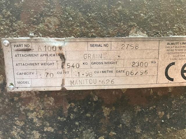 Albutt A100 Grain Bucket, Manitou Brackets, Year 1996, Width 7ft (2.13m), Capacity 1.98cuM (70 cu/ft)