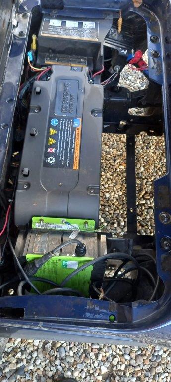 PATRIOT BLUE 48 VOLT DC LITHIUM ION, ON BOARD CHARGER, FOLD DOWN WINDSHIELD, STONE BEIGE SUNTOP STONE BEIGE SEATS, TWIN BAG CARRIER, SWEATER BASKET.