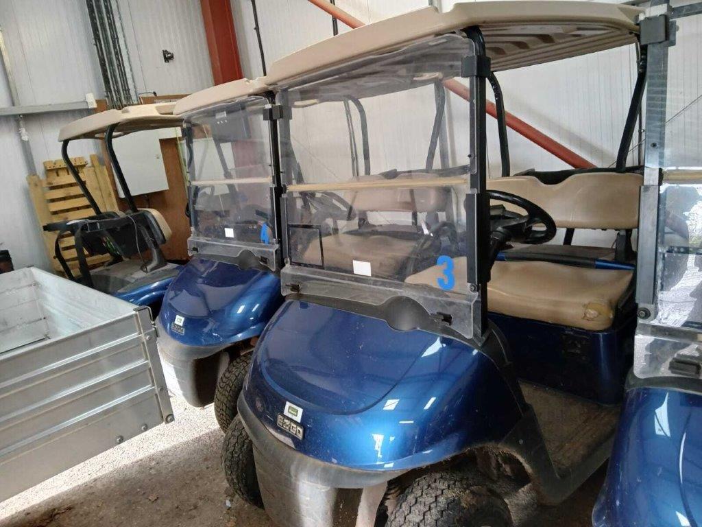 ELECTRIC BLUE 48 VOLT, ON BOARD CHARGER, BATTERY FILLING KIT, FOLD DOWN WINDSHIELD, STONE BEIGE SUNTOP AND SEATS, TWIN BAG CARRIER, SWEATER BASKET.