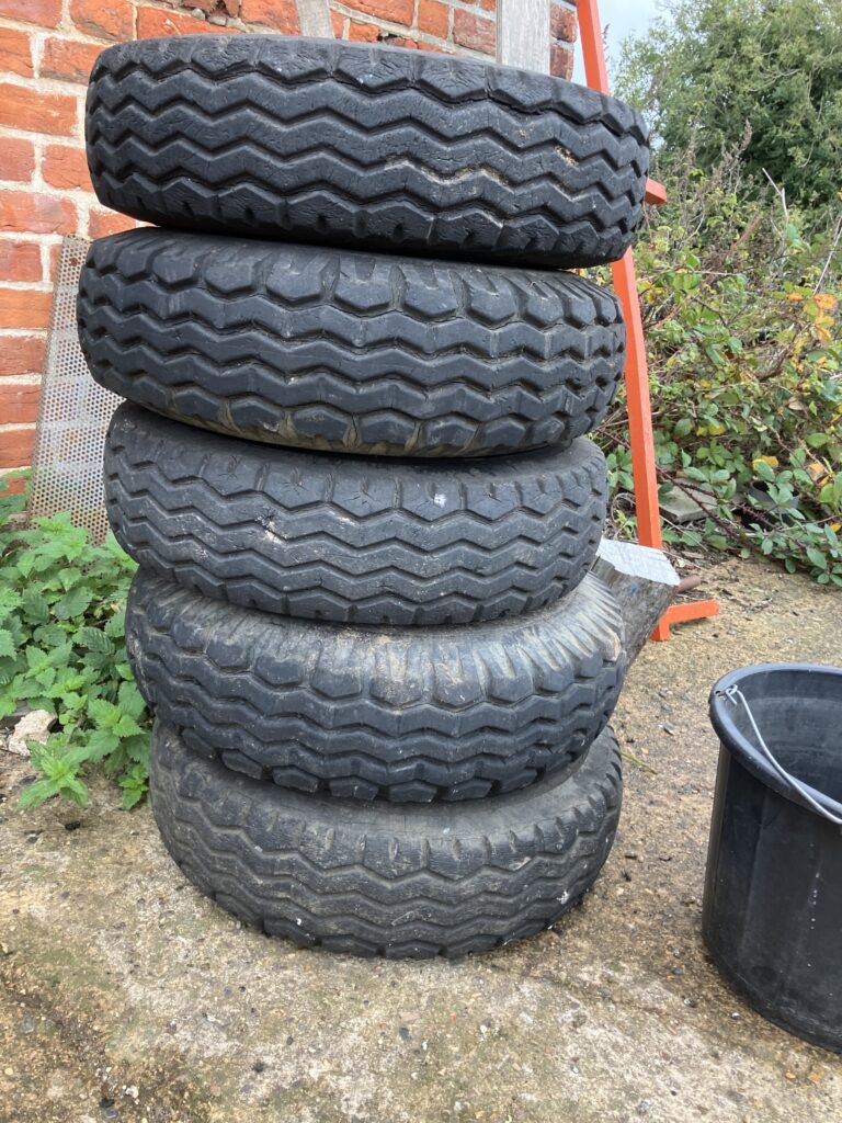 For sale five 600×9 high speed tyres on old type ifor Williams rims all hold air and are serviceable £130