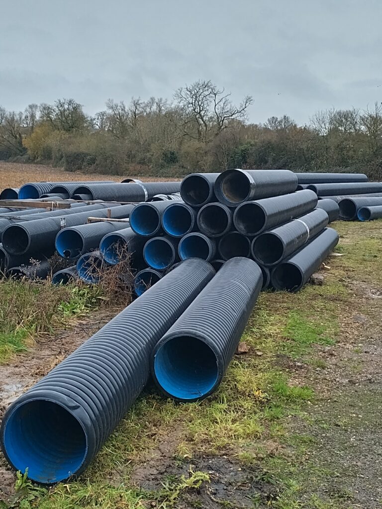 NEW JFC & Polypipe. Twin Walled, Perforated & Non Perforated, 375 / 600mm diameter available in 6mtr lengths. ex Milton Keynes. C.J Smith, tel 07831 479966.